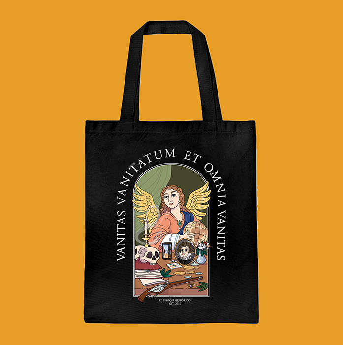 Bolsa de tela negra con el diseño de mi propia Vanitas, uno de los temas favoritos del barroco, en el que se muestra la futilidad de la vida y de la inevitabilidad de muerte. ¡Vanidad de vanidades, todo es vanidad!